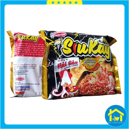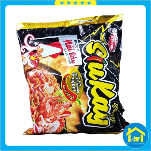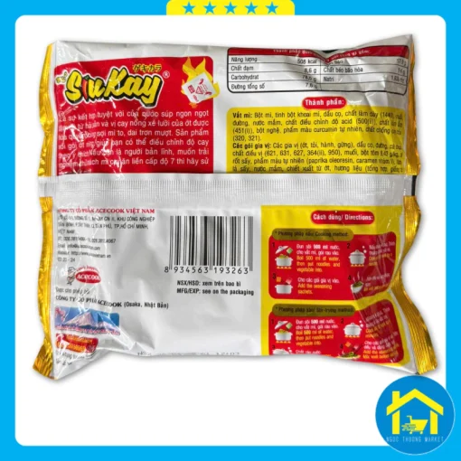 Bột mì, tinh bột khoai mì, dầu cọ, chất làm dày (1440), muối, đường, nước mắm, chất tạo xốp (500(ii)), chất ổn định (451()), bột nghệ, phẩm màu curcumin tự nhiên, chất chống oxy hóa (320, 321). – Các gói gia vị: