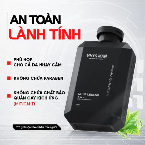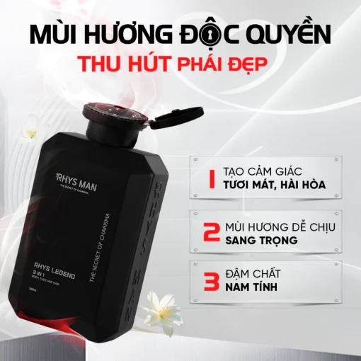 Tắm gội hương nước hoa 3 trong 1 Rhys Legend tiện dụng với công thức kết hợp sữa tắm, rửa mặt và dầu gội cho tóc chắc khỏe và cảm giác toàn thân sạch sảng khoái